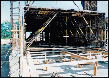 Ezek alkották a leendő helyiség oldalfalait és mennyezetét. Ebbe a formába helyezték el a vasalatot, majd kiöntötték betonnal. A beton megkötése után a zsaluzatot sínen kihúzták, daruval a következő szintre emelték, és a folyamat kezdődött elölről.